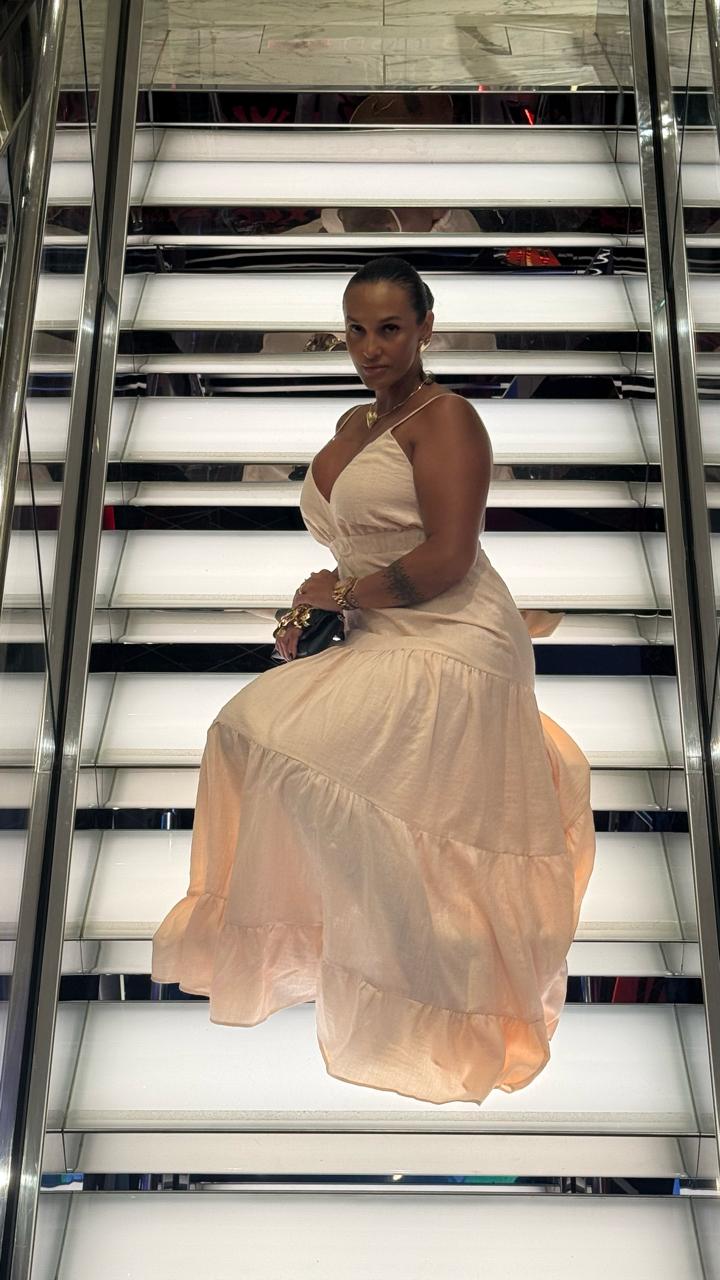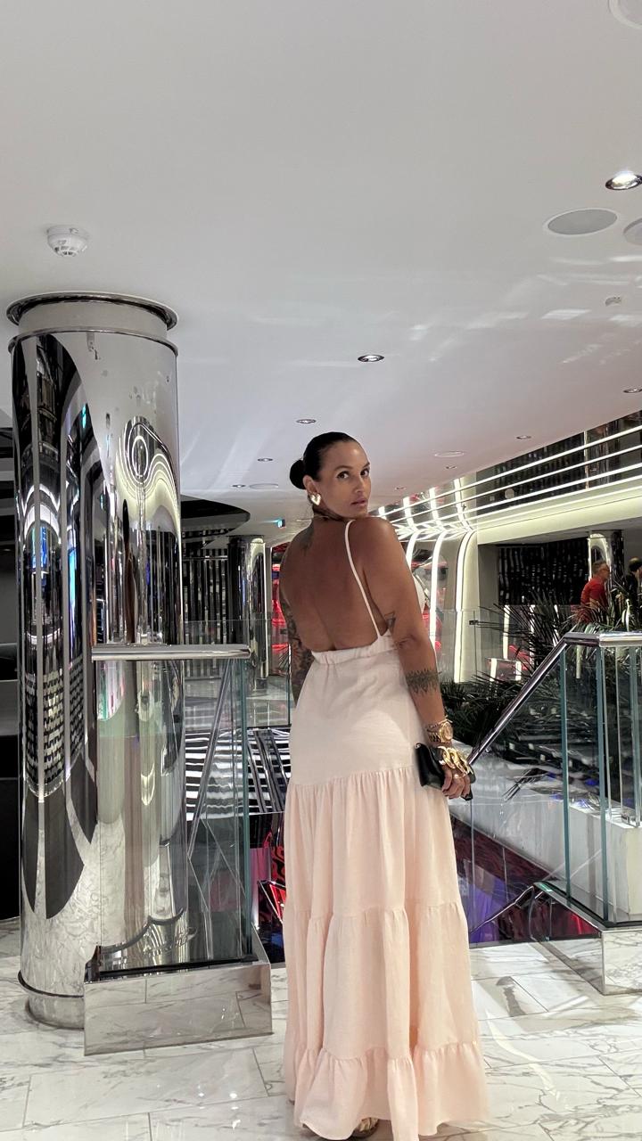 Vestido longo, com um caimento sofisticado que valoriza cada movimento