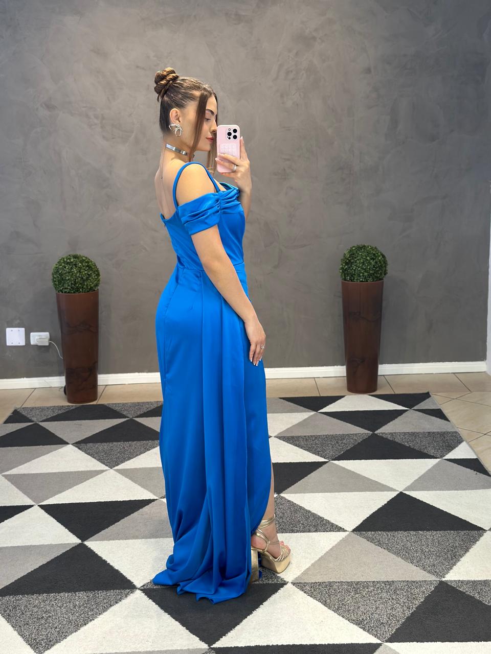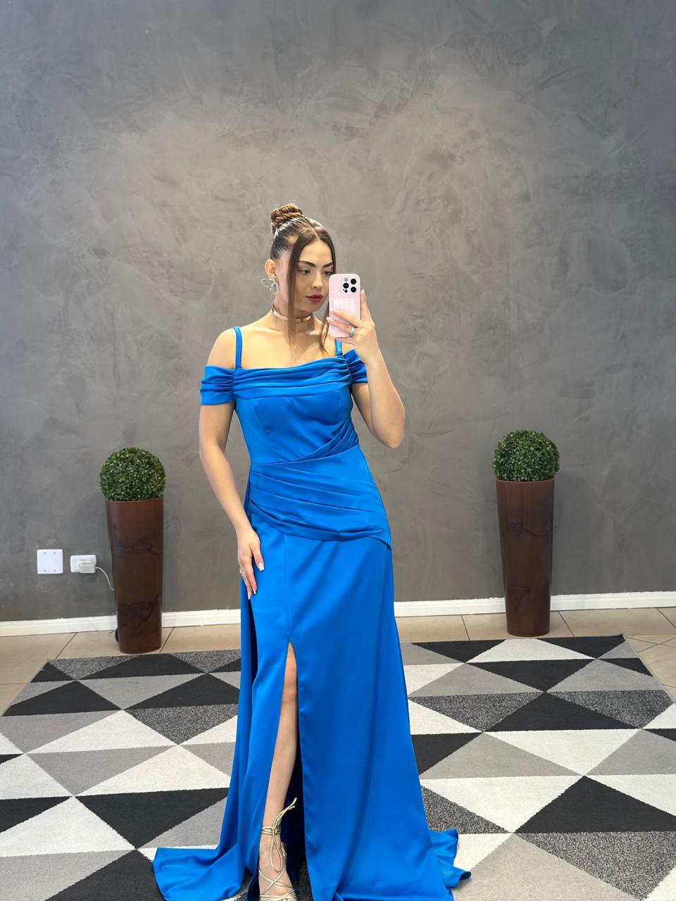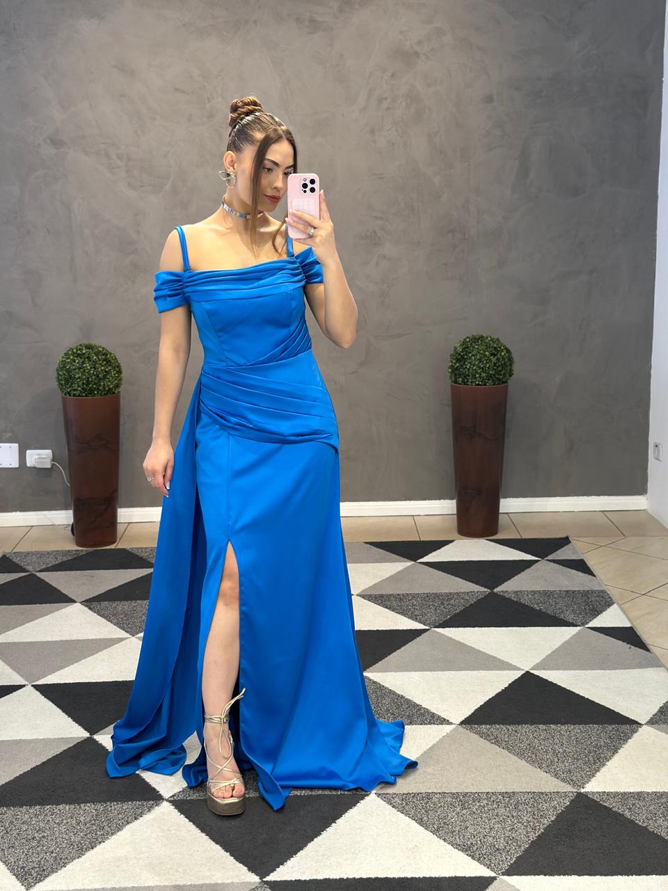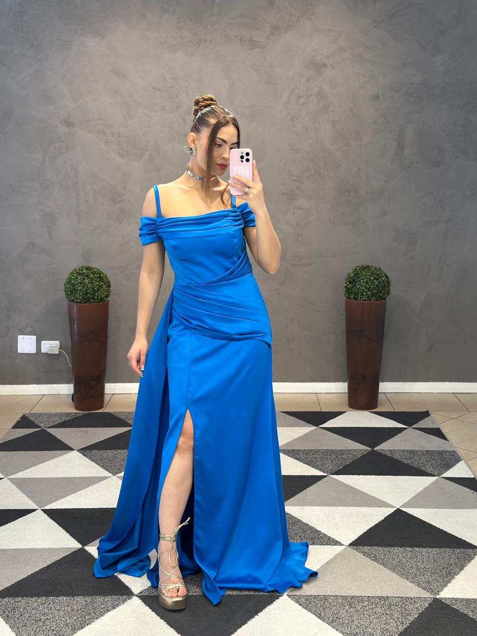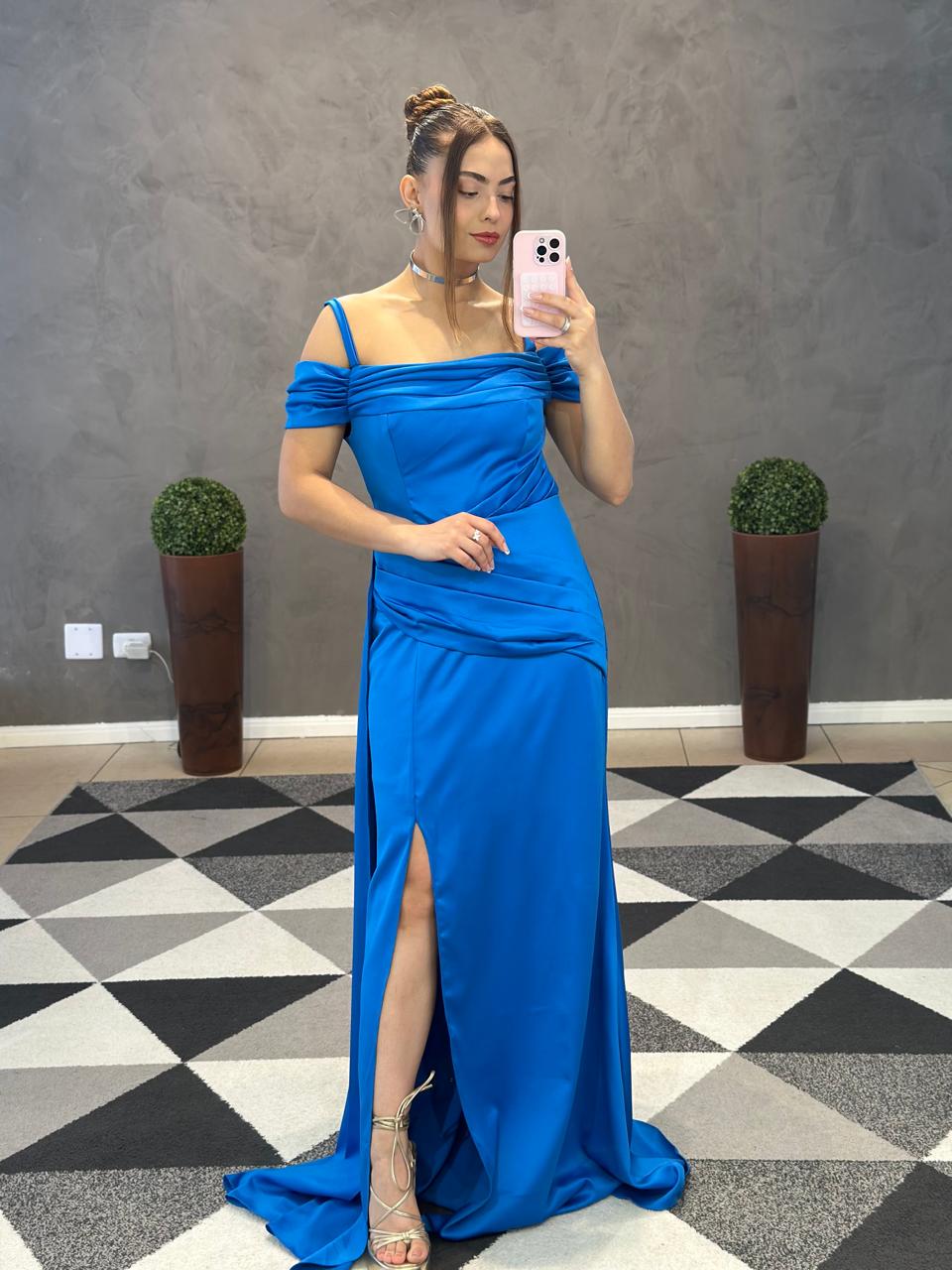 Vestido em cetim com fenda e calda, um designe elegante com um toque de ousadia, possui detalhes drapeados para trazer mais sofisticação para um evento especial.